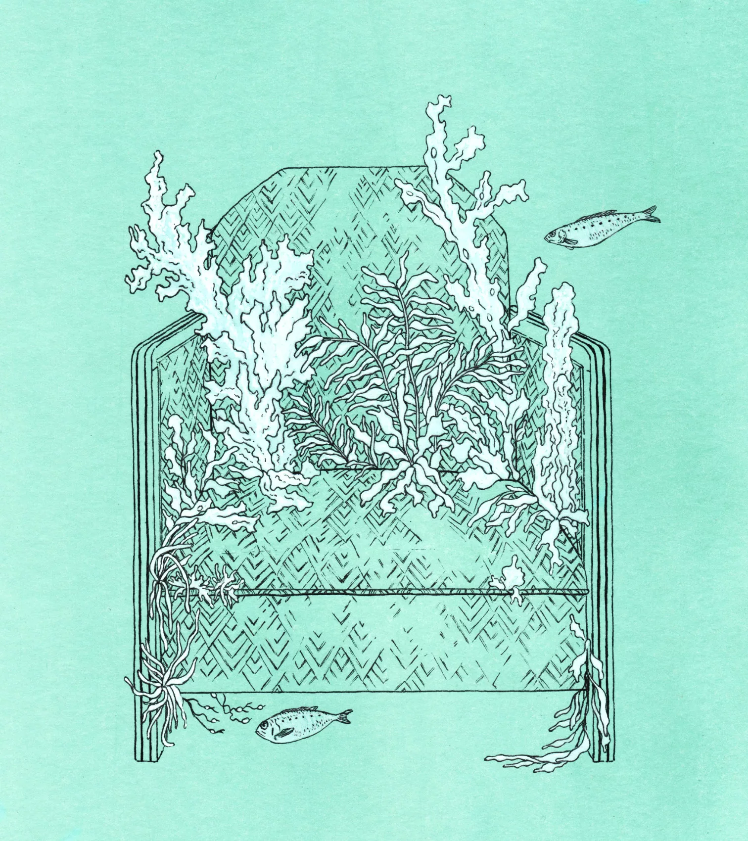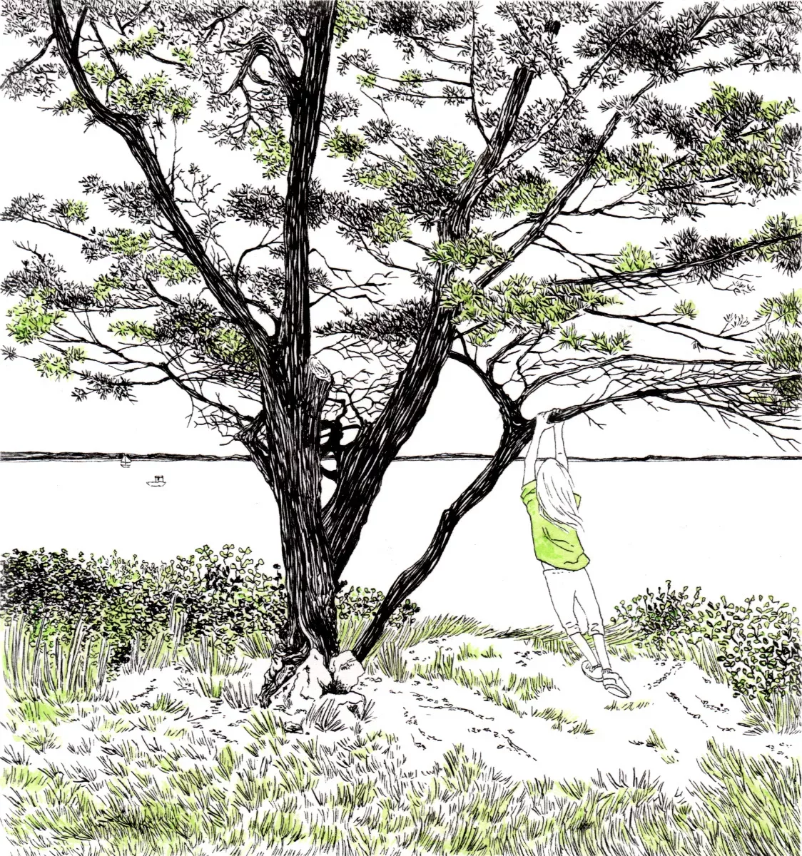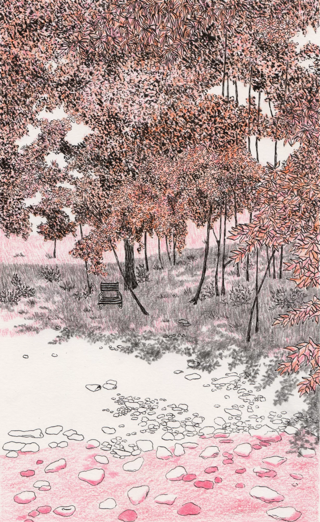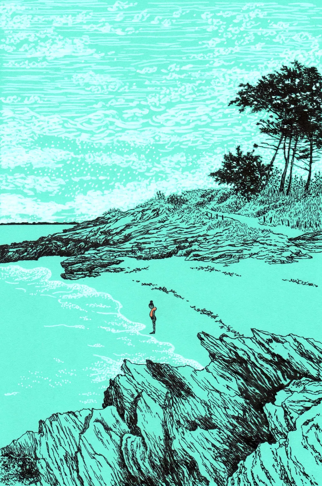 drawing of a beach with rocks on the foreground and trees in the background, made with orange, grey and black inks
