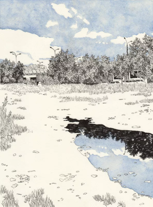 C’est un terrain près de chez moi, je passe devant quasiment tous les jours. Je le vois évoluer dans le temps, au gré des saisons, de l’évolution de la végétation et des flaques, des dépôts, des utilisations, des déplacements de barrières.
